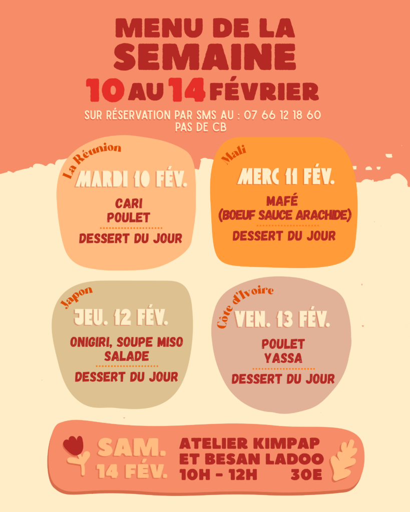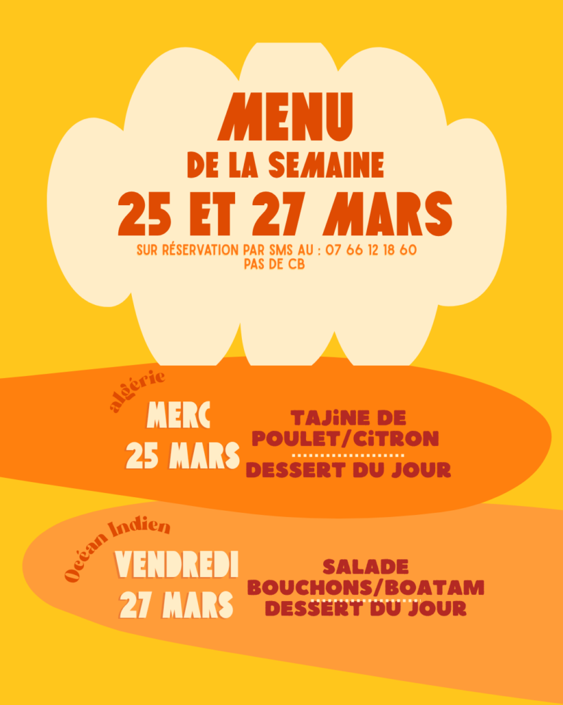sur réservation, par SMS ou mail en indiquant nom, jour et nombre de personnes.